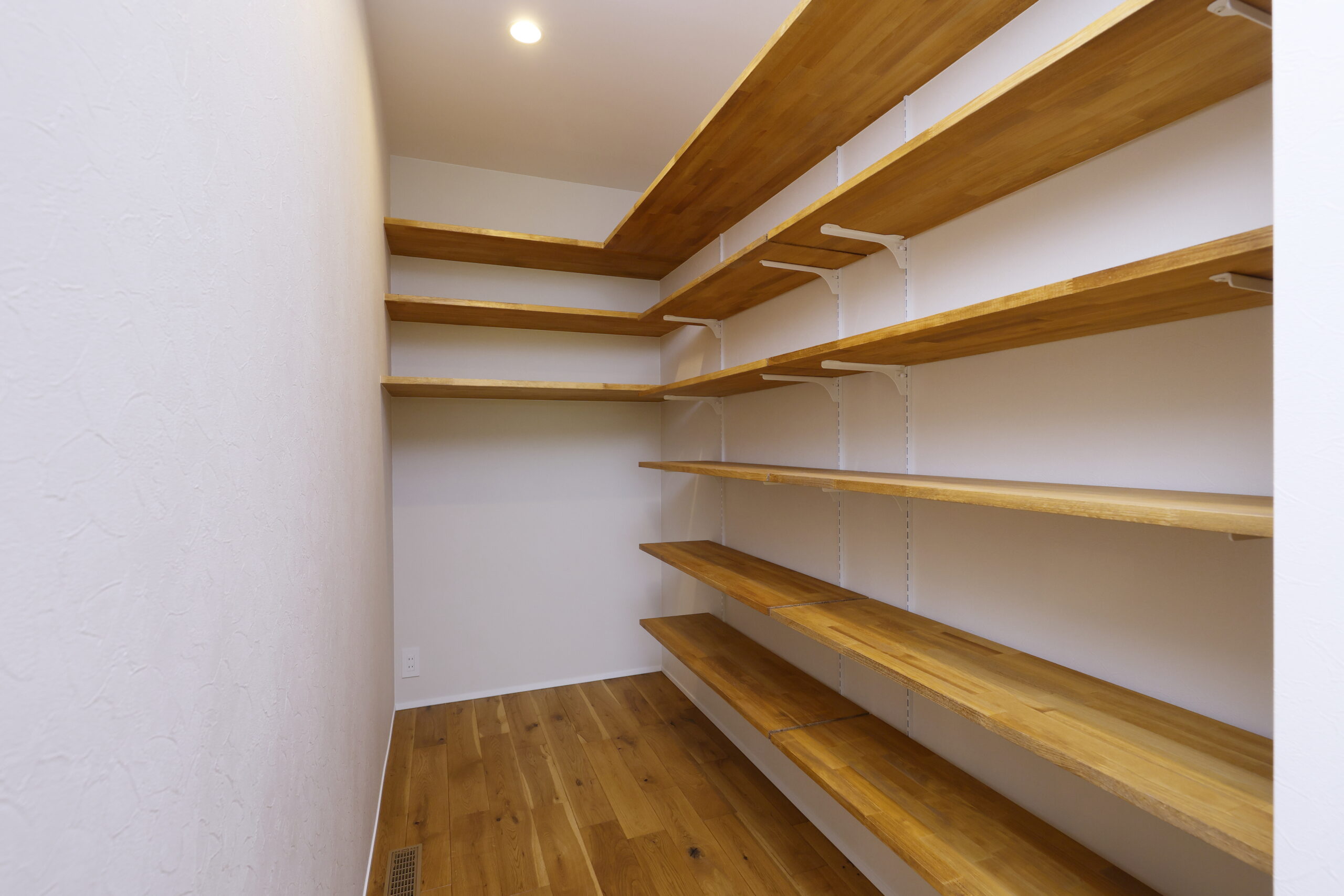 キッチン背面に扉を設け、壁一面を収納として活用したパントリー。